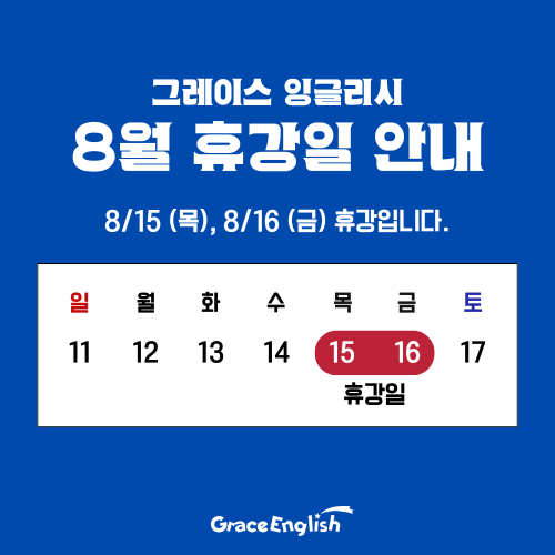 2024년 8월 휴강일 안내 Grace English 24-07-29 관련링크 안녕하세요. 그레이스 잉글리시 2024년 8월 휴강일 안내입니다.8월 15일 목요일, 8월 16일 금요일은 그레이스 잉글리시 휴강일로 수업이 없습니다.그레이스 잉글리시에서 지정하는 휴강일에 정규수업이 있는 경우, 수업 종료일이 뒤로 미뤄지게됩니다.무더운 여름 건강 조심하시길 바랍니다. 감사합니다^^ 댓글목록 등록된 댓글이 없습니다. 목록