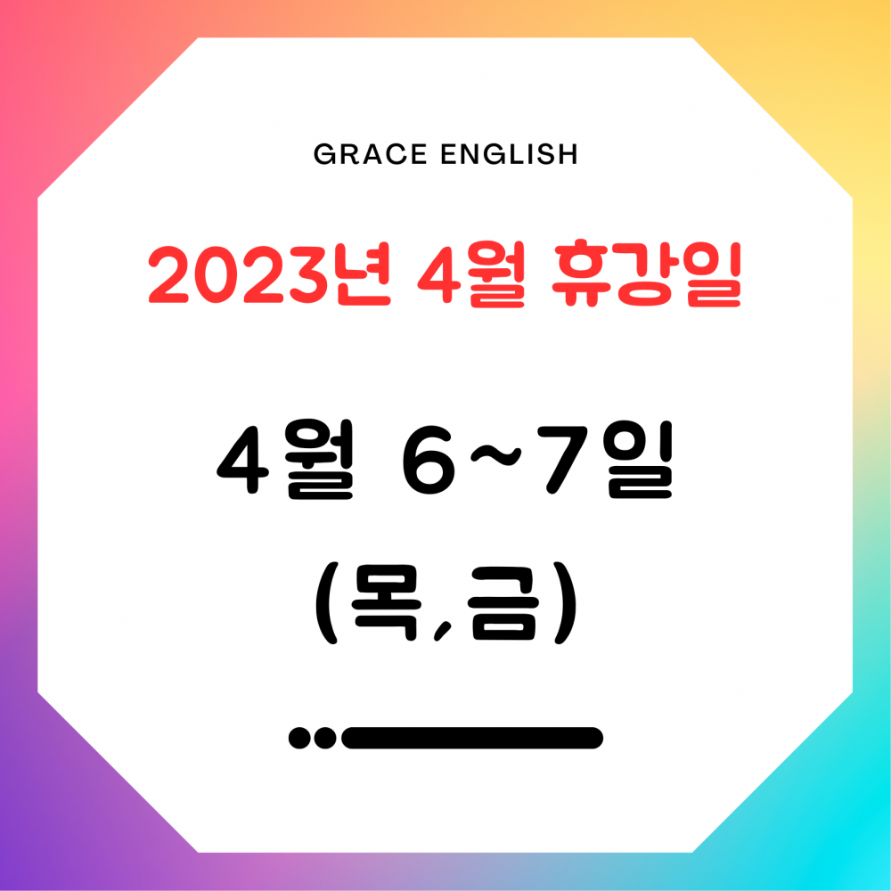 2023년 4월 휴강일 안내 Grace English 23-03-14 관련링크 안녕하세요~ 그레이스 잉글리시2023년 4월 휴강일 안내입니다 4월 6~7 (목,금)은 휴강일로수업과 고객센터가 운영되지 않습니다. 그레이스 잉글리시에서 지정한 휴강일에 수업이 있는 경우, 자동으로 수업 연기가 되어 수업 종료일이 뒤로 미뤄지게 됩니다. 감사합니다^^ 댓글목록 등록된 댓글이 없습니다. 목록