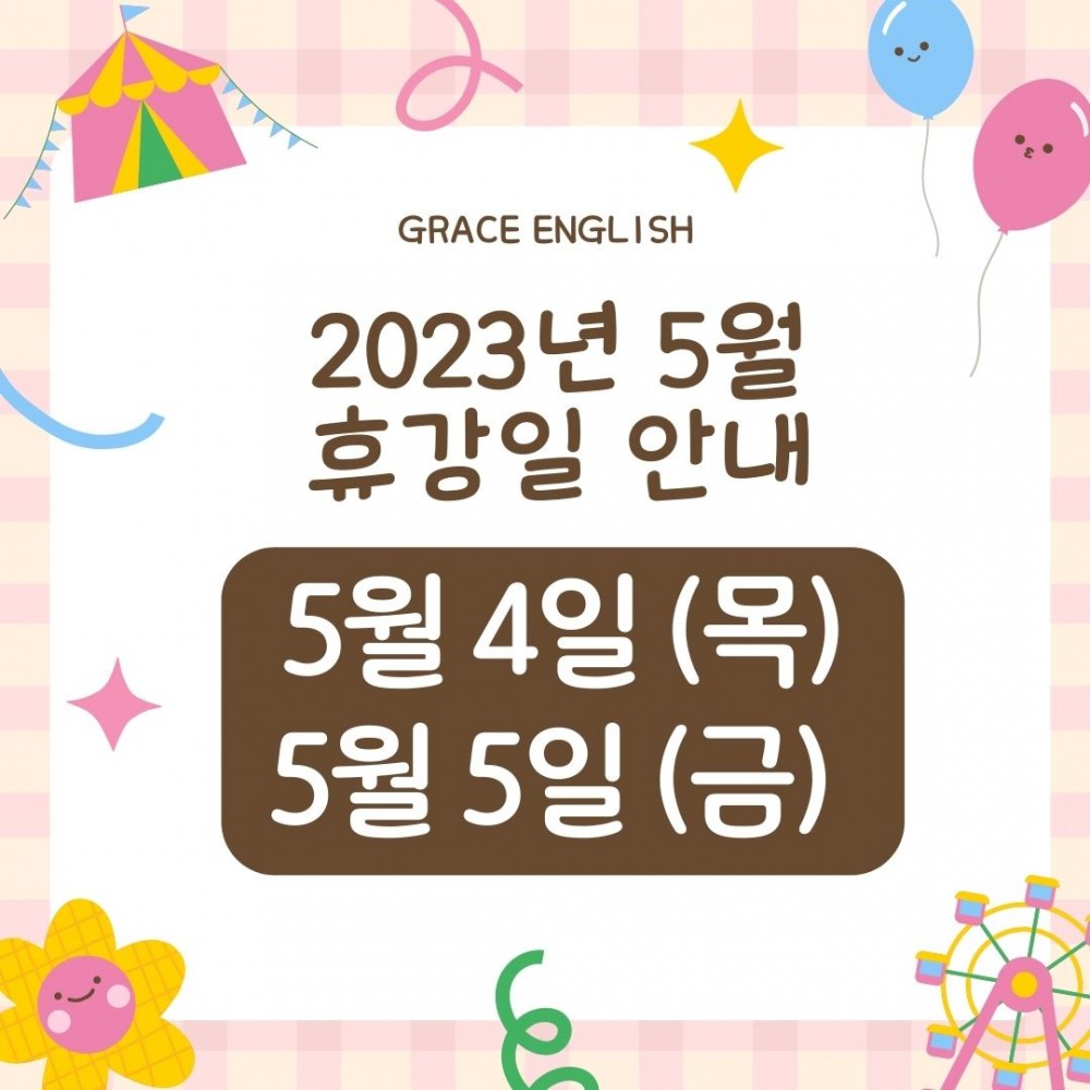 2023년 5월 휴강일 안내 Grace English 23-04-13 관련링크 안녕하세요~ 그레이스 잉글리시2023년 5월 휴강일 안내입니다. 5월 4~5 (목,금)은 휴강일로수업과 고객센터가 운영되지 않습니다. 그레이스 잉글리시에서 지정한 휴강일에 수업이 있는 경우, 자동으로 수업 연기가 되어 수업 종료일이 뒤로 미뤄지게 됩니다. 즐거운 가정의 달 보내세요~감사합니다^^ 댓글목록 등록된 댓글이 없습니다. 목록