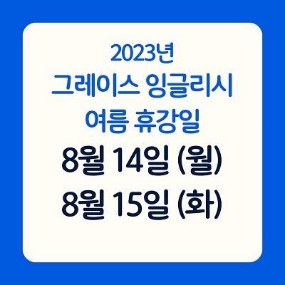 2023년 8월 14일, 15일 휴강일 안내 Grace English 23-07-28 관련링크 해당 요일에 정규수업이 있는 경우, 수업 종료일이 뒤로 미뤄지게 됩니다. 댓글목록 등록된 댓글이 없습니다. 목록