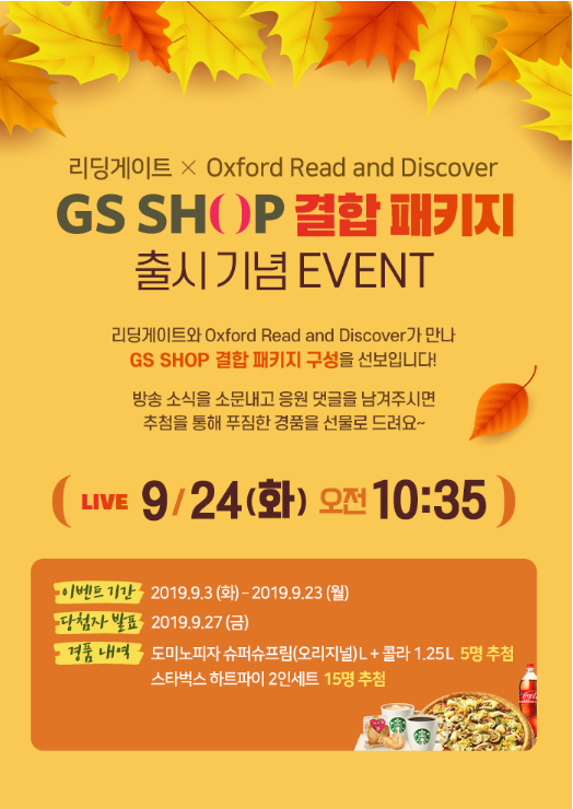 [GS SHOP] 리딩게이트 X Oxford Read and Discover 결합 패키지 이벤트 (~2019년 9월 23일까지… 최고관리자 19-09-04 관련링크 이번 9월 리딩게이트와 Oxford Read and Discover (ORD)가 만나동화 스토리에서 과학 논픽션까지 영어 실력 키우는새로운 결합 패키지를 GS SHOP에서 만나보실수 있어요~ 기간: 2019년 9월 3일 ~ 9월 23일 자세한 이벤트가 궁금하시면 클릭하세요 댓글목록 등록된 댓글이 없습니다. 목록