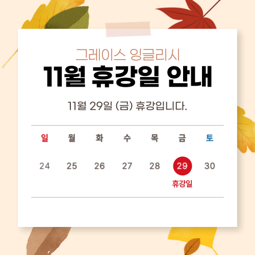 2024년 11월 휴강일 안내 Grace English 24-11-12 관련링크 안녕하세요. 그레이스 잉글리시 2024년 11월 휴강일 안내입니다. 📍11월 29일 (금)은 그레이스 잉글리시 휴강일입니다. ※그레이스 잉글리시에서 지정한 휴강일에 정규수업이 있는 경우, 자동으로 수업 연기가 되어 수업 종료일이 뒤로 미뤄지게 됩니다.감사합니다😊 댓글목록 등록된 댓글이 없습니다. 목록