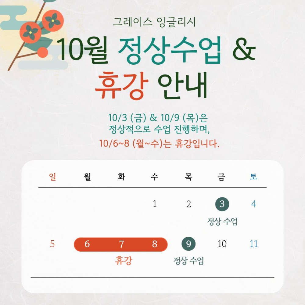 안녕하세요^^ 그레이스 잉글리시 2025년 10월 정상수업 및 휴강일 안내입니다.
