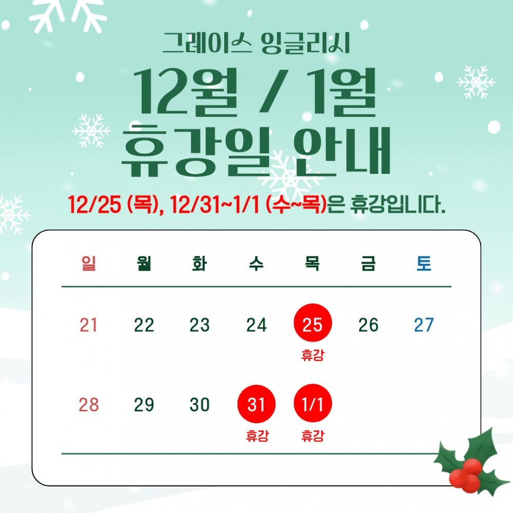 2025년 12월 & 신년 휴강일 안내 Grace English 25-11-28 관련링크 2025년 12월, 2026년 신년 휴강일 안내 12월 25일 (목)12월 31일 (수)1월 1일 (목) 해당일은 휴강일로 수업과 상담 업무가 없습니다. 그레이스에서 지정한 공식 휴강일에 수업이 있는 경우, 수업이 연기 됩니다. (수업 종료일이 자동으로 뒤로 미뤄지게 됩니다.) *** 소중한 연말연시 즐거운 시간 보내시길 바라며 건강하고 평안한 신년 되시길 소망합니다. 감사합니다^^ 댓글목록 등록된 댓글이 없습니다. 목록
